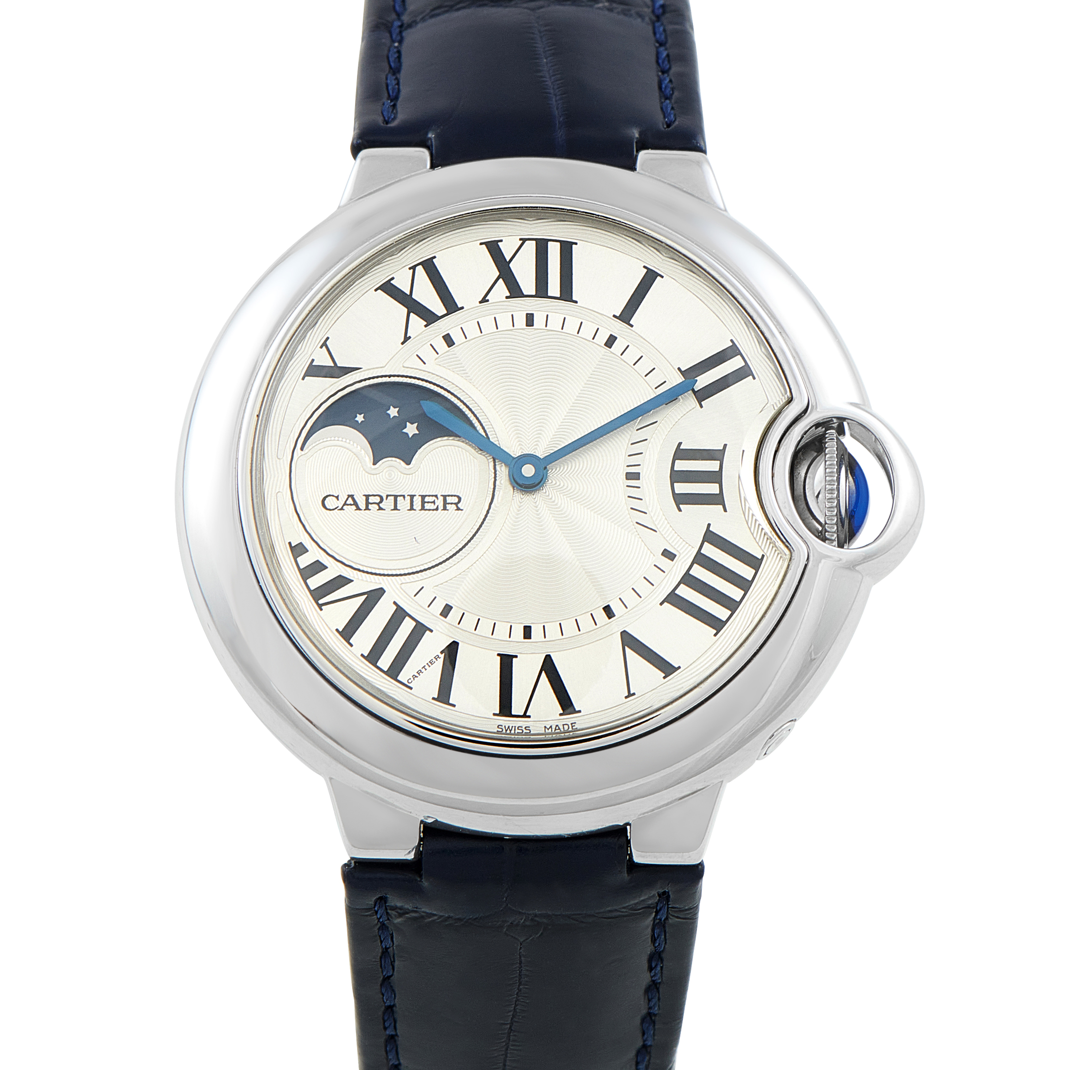 Named after the French word for round, Ronde watches are not the typical shaped watches that Cartier is famous for making. Yet, these round watches are instantly recognizable as Cartier creations thanks to signature brand designs like the Roman numerals and blue hands on the dials, not to mention the blue stone-topped crowns.